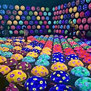 Designed to blur the relationship between art, space, and the human senses, the exhibition invites visitors to move freely through a series of interactive environments. Digital flocks of birds appear to respond to movement, water seems to flow beneath visitors’ feet, and large-scale installations shift and transform in real time. One of the most popular works, Morphing Continuum, features glowing crystalline spheres that merge and separate in constantly changing formations.