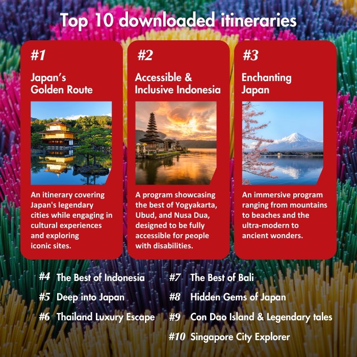 This year, the most-viewed itineraries on our Agent Hub reflect the growing demand for cultural and inclusive journeys. Programs like Japan’s Golden Route and Accessible & Inclusive Indonesia highlight the demand for diverse and inclusive travel options in iconic locations. From luxury escapes to hidden gems, these itineraries captured the imagination of travellers seeking meaningful exploration.