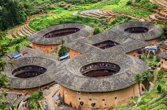 Fujian is home to the mysterious Tulou structures – large, round, rammed-earth buildings that date back thousands of years. They were built by the Hakka people, a sub-group of the Han, at a time when fierce bandits roamed the countryside and defensive structures were imperative. The communal earthen buildings housed extended families to provide protection from nomadic marauders.
